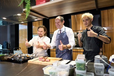 隨後谷力哲處長與副市長鄭照新、經發局長張峯源體驗歐式料理,由私廚選用在地優質食材,透過歐式手法精心烹調,兼顧視覺、味覺與嗅覺享受,述說主廚獨特的跨國小故事,讓谷力哲處長感受台中多元包容的國際文化;享用主菜時,谷力哲處長更穿上圍裙,親自為賓客分切烤肉,動作熟練、態度親切幽默,化身「外交大廚」!