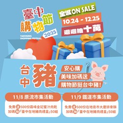 防疫持續不鬆懈、美好滋味回歸再現!台中市政府感謝所有防疫人員、市民及產業界的體諒與支持,台中購物節續挺「台中豬」,除於明(8)日霧峰原流市集發放肉乾,並加碼於11月9日下午2時50分在台中車站「鐵道市集」發送500份排骨酥,還有線上線下加碼共抽出50盒肉製品禮盒。今年鐵道市集主推「舊城新潮、潮玩中城」,結合中區電子、繼光、自由三大商圈,以及原民、女性市集等元素,活絡中區商機,歡迎民眾到場享受午後市集時光、行動力挺台中豬。