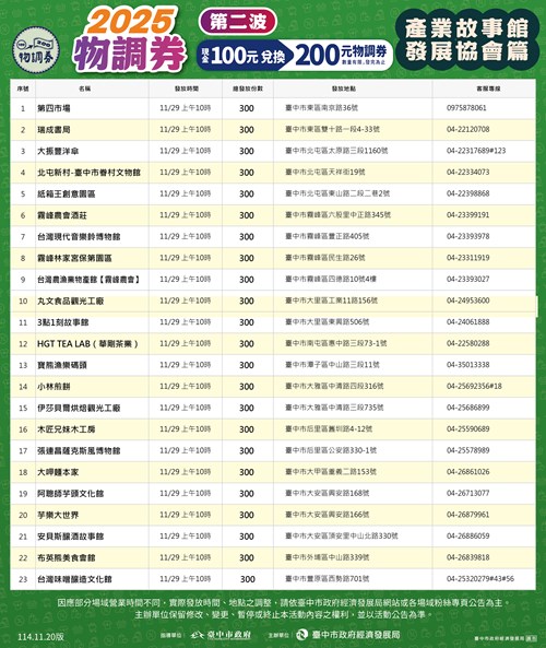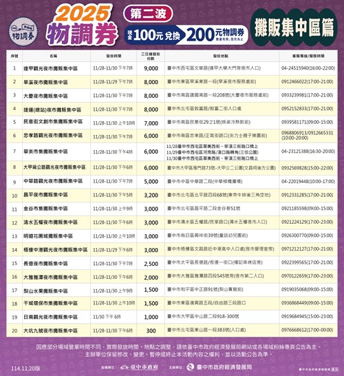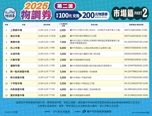 本年物調券第二波於11月發放,共計發放35萬份,於本市公有市場、民有市場、公有委外市場、民營市場、攤販集中區、商圈,以及臺中市產業故事館發展協會所屬會員店家發放,總計108處場域。提供民眾以現金100元,兌換200元之物調券,每場域預計各發放300份~10,000份不等之物調券。35萬份物調券票券價值達7,000萬元。民眾可於使用期間內,至物調券上所示之場域使用購買產品。