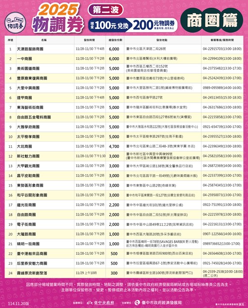 (1)商圈:大雅學府商圈、東海藝術街商圈、大甲觀光商圈、大里中興商圈、太平樹孝商圈、后里泰安魅力商圈、豐原廟東復興商圈、新社魅力商圈、東勢區形象商圈、臺中港舶來品商圈、和平谷關形象商圈、自由路五金電料商圈、昌平皮鞋商圈、逢甲商圈、一中商圈、天津路服飾商圈、大坑商圈、繼光街商圈、電子街商圈、大隆路商圈、精明一街商圈、美術園道商圈、自由路商圈。商圈物調券適用店家名單: https://reurl.cc/1kmeQX