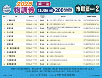 「物調券」發放活動,每一波皆為本市庶民經濟帶來強大效益,本年下半年為再次提升消費者聚集,增強行銷廣度,將續整合臺中傳統市場在地美食、新興夜市小吃、商圈潮流服飾等資源,將辦理第二波物調券發放活動,使全國民眾對本市豐富多元的市集文化留下深刻印象,進而提高整體規模,活絡振興本市經濟。