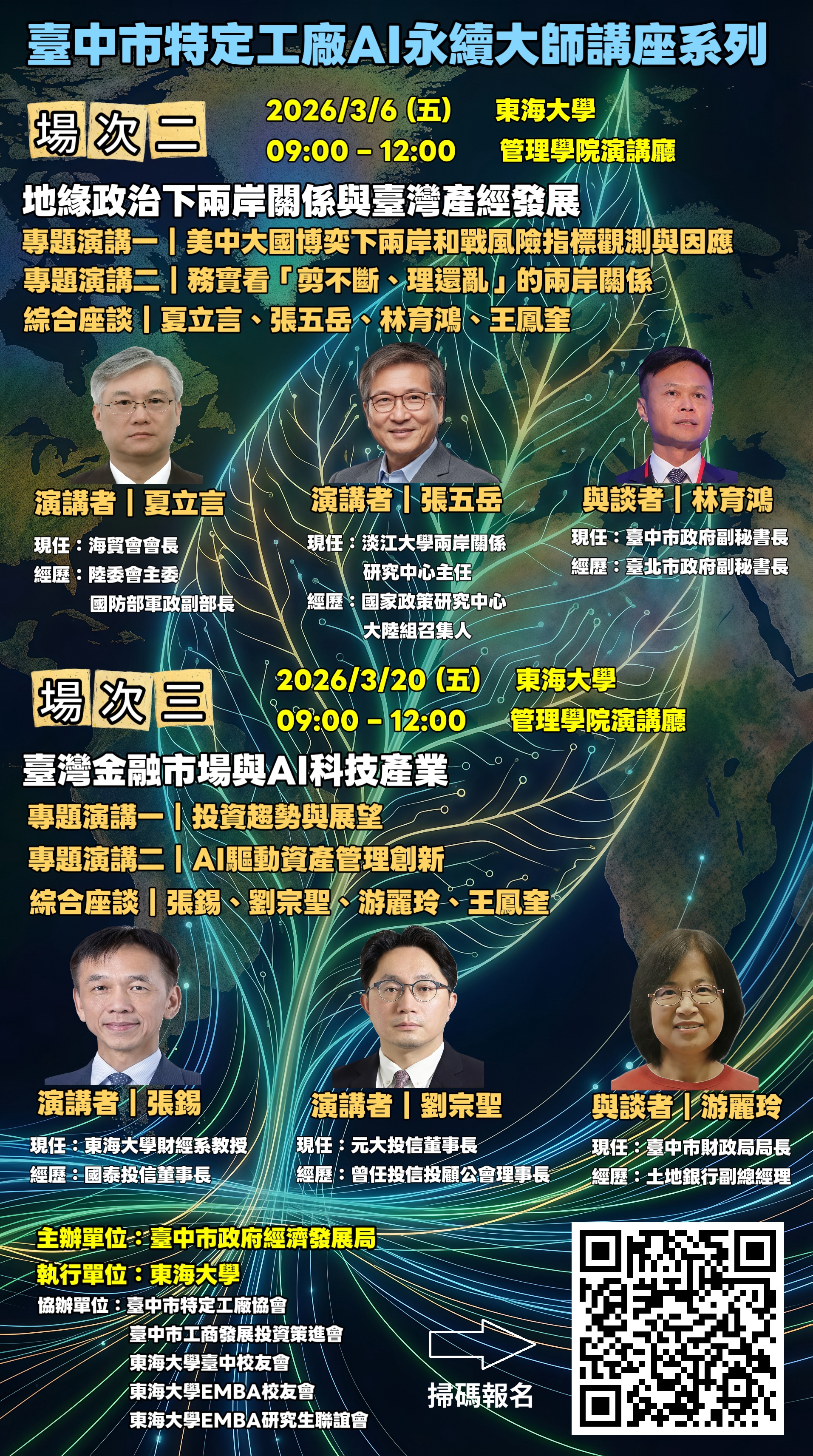2026最熱議題:地緣政治如何牽動兩岸和戰風險與臺灣產經走向?AI浪潮又會如何改寫金融市場與投資價值?AI永續大師講座第23場一次解題。
