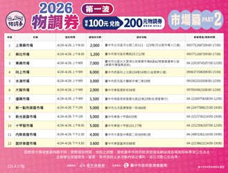 - 38處公有零售市場(以攤位數15攤以上之市場,或具小型規模之市場為主):建國公有零售市場、豐原第一公有零售市場、霧峰公有零售市場、東光公有零售市場(併同東峰公有零售市場使用)、第二公有零售市場(併同篤行公有零售市場使用)、清水第一公有零售市場、第五公有零售市場、大甲第二公有零售市場(併同外埔公有零售市場使用)、第三公有零售市場、中義公有零售市場(併同何厝公有零售市場使用)、梧棲第一公有零售市場(併同梧棲第二公有零售市場使用)、第一公有零售市場、南屯公有零售市場、大肚公有零售市場、沙鹿公有零售市場、大甲第一公有零售市場、大雅公有零售市場、東勢公有零售市場、太平公有零售市場、一心公有零售市場、烏日公有零售市場、福安公有零售市場、大進公有零售市場(併同大新公有零售市場、小康公有零售市場使用)、清水第二公有零售市場、合作公有零售市場、后里第一公有零售市場、后里第三公有零售市場、龍泉公有零售市場、神岡公有零售市場。(總計於29處市場發放,可於38處市場使用。)