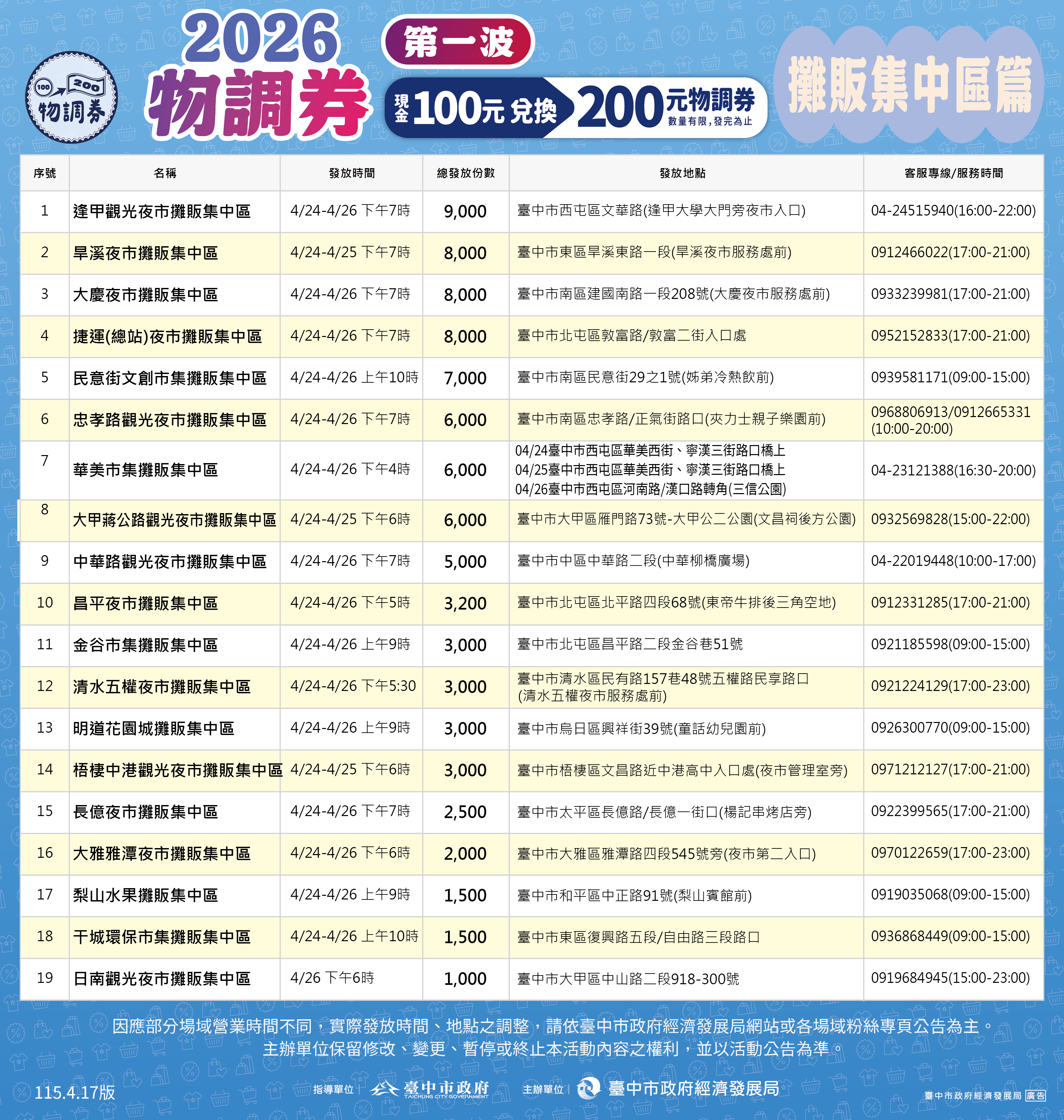 本年物調券第一波於4月發放,共計發放35萬份,於本市公有市場、民有市場、公有委外市場、民營市場、攤販集中區、商圈,以及臺中市產業故事館發展協會所屬會員店家發放,總計107處場域。提供民眾以現金100元,兌換200元之物調券,每場域預計各發放300份~10,000份不等之物調券。35萬份物調券票券價值達7,000萬元。民眾可於使用期間內,至物調券上所示之場域使用購買產品。