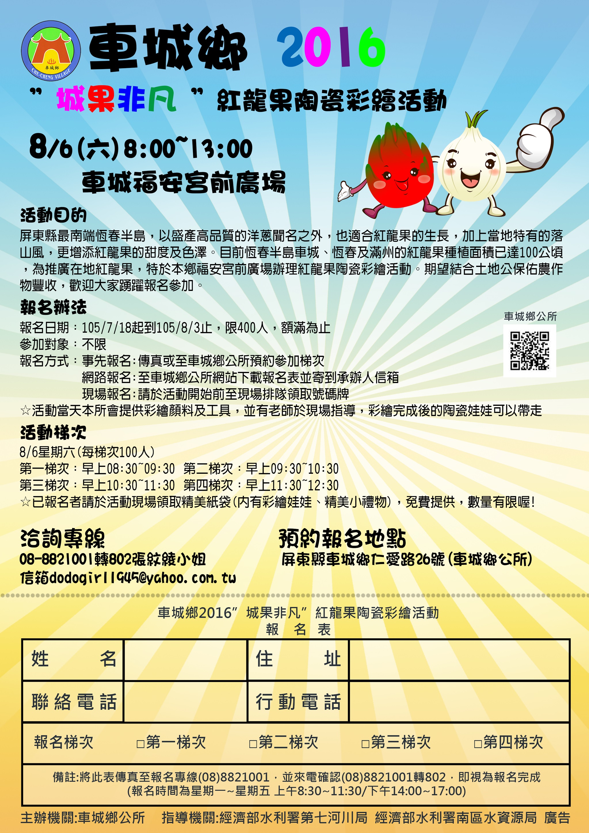 屏東縣車城鄉公所「105年車城鄉城果非凡紅龍果評鑑暨農特產品地產地銷活動」,一、活動日期及時間:105年8月5日~6日上午8時至12時。