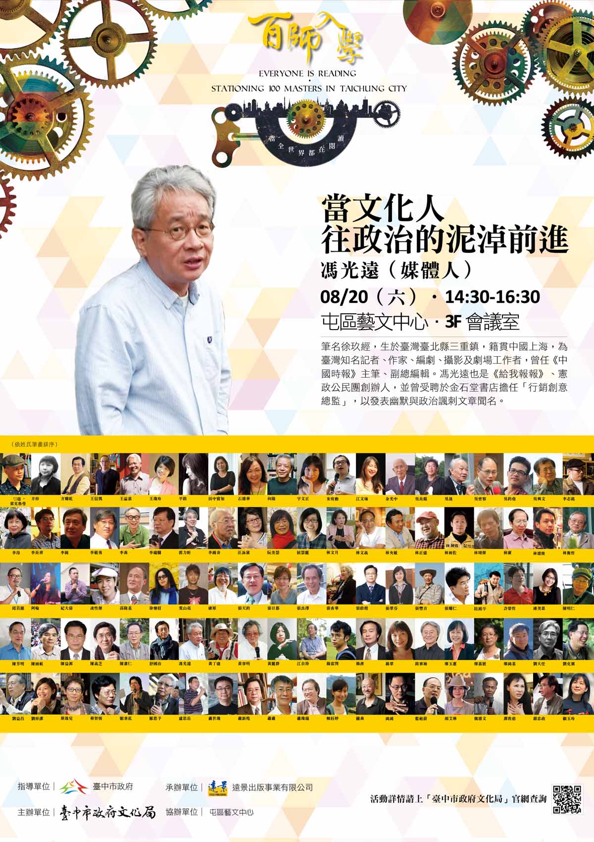 二、「百師入學」講座在屯區藝文中心由知名作家、編劇及劇場工作者馮光遠分享「當文化人往政治的泥淖前進」,歡迎踴躍參加!