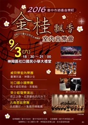 2016臺中市逍遙音樂町─神岡金桂飄香室內音樂會,9月3日下午6時30分起假神岡區社口國小大禮堂舉辦,邀請本市傑出演藝團隊「古典管弦樂團」,以及「社口國小國樂團」、「威貝樂室內樂團」等中西樂團,還有神岡區新銳之星「吳少程」演出精采音樂及歌曲,邀請您聆賞今秋最高水準的音樂盛宴!