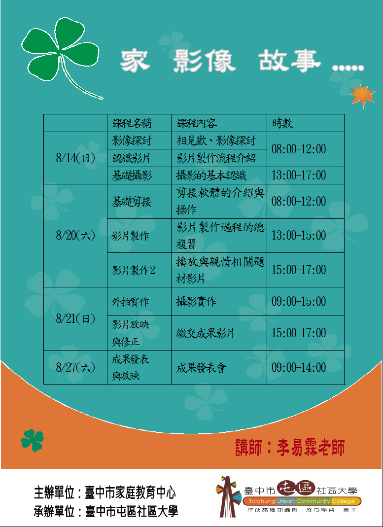 三、課程時間:8月14日(日)、8月20日(六)、8月21日(日) 、8月27日(六)。