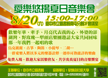 一、臺中市立圖書館南屯分館訂於8月20日(六)舉辦「愛樂悠揚夏日音樂會」活動,邀請犁頭店樂團以各種中西樂器演奏及詮釋多首經典樂曲,提升民眾藝文欣賞及走入圖書館閱讀之興趣。