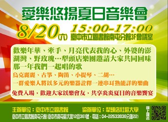 一、臺中市立圖書館南屯分館訂於8月20日(六)舉辦「愛樂悠揚夏日音樂會」活動,邀請犁頭店樂團以各種中西樂器演奏及詮釋多首經典樂曲,提升民眾藝文欣賞及走入圖書館閱讀之興趣。二、時間:105年8月20日(六)下午3時至5時。三、地點:臺中市立圖書館南屯分館3樓會議室(臺中市南屯區大墩十二街361號)。 聯絡人:林小姐 聯絡電話:04-22533836