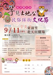 為發揚延續土地公精神與文化,並推廣豐原區東湳里在地農產品芋頭,豐原區公所與臺中市豐原區東湳里發展協會於今(105)年9月11日(日)下午共同舉辦旨揭活動,活動內容包括彩繪土地公、芋頭及土地公踩街繞境及以芋頭為主的福宴等活動,歡迎踴躍報名熱情參與,一同享受都市人文與農業社區的樣貌之美。 聯絡人:李玟欣 聯絡電話:25222106#308