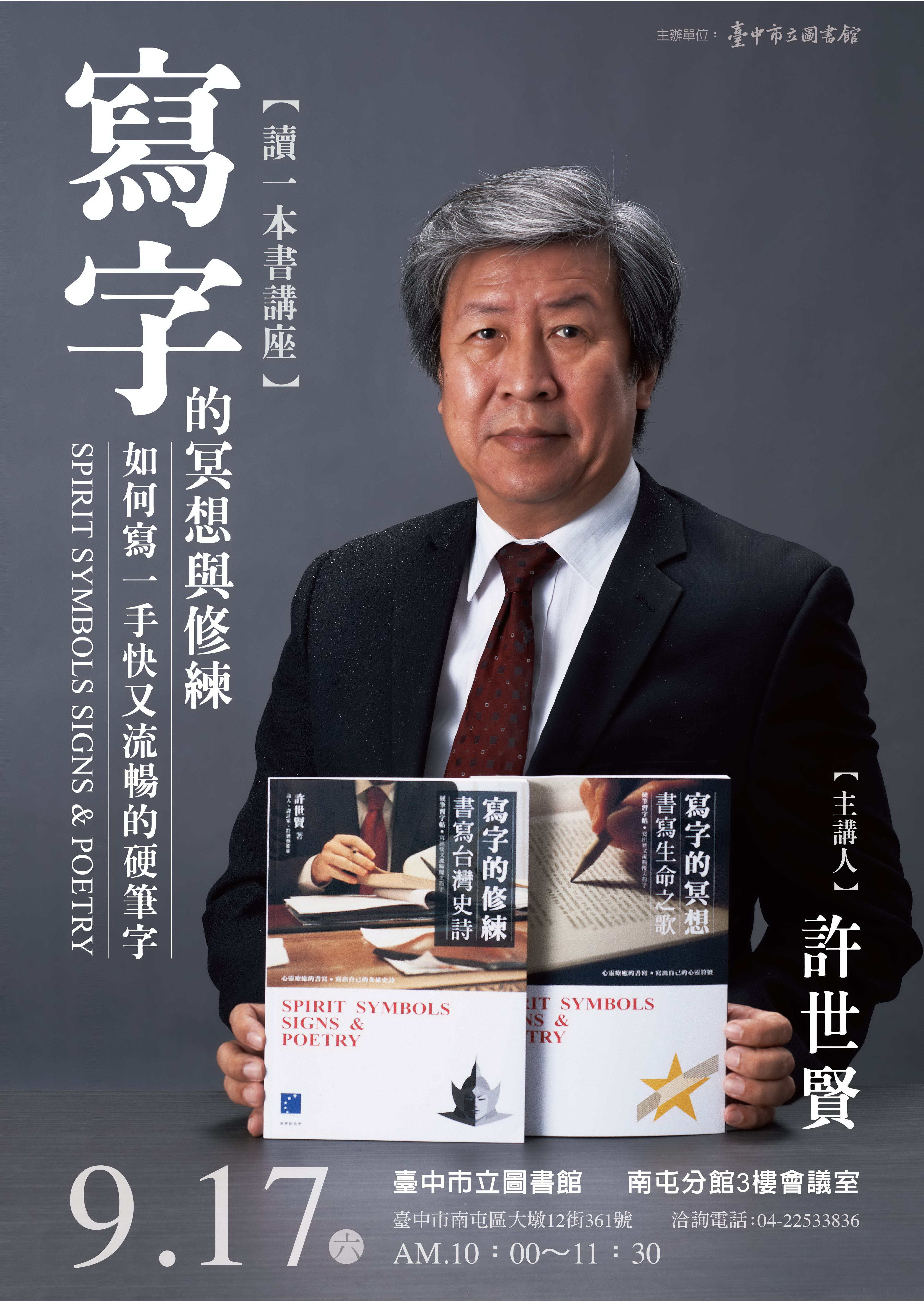 旨揭講座訂於本(105)年9月17日(六)舉辦,將邀請符號藝術家許世賢分享「寫字的冥想與修練-如何寫一手快又流暢的硬筆字」。老師將以互動的方式,帶領大家臨摹書寫詩集,藉此習得正確的寫字方法,並領略詩歌美妙之處。
