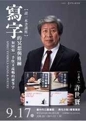 一、旨揭講座訂於本(105)年9月17日(六)舉辦,將邀請符號藝術家許世賢分享「寫字的冥想與修練-如何寫一手快又流暢的硬筆字」。老師將以互動的方式,帶領大家臨摹書寫詩集,藉此習得正確的寫字方法,並領略詩歌美妙之處。