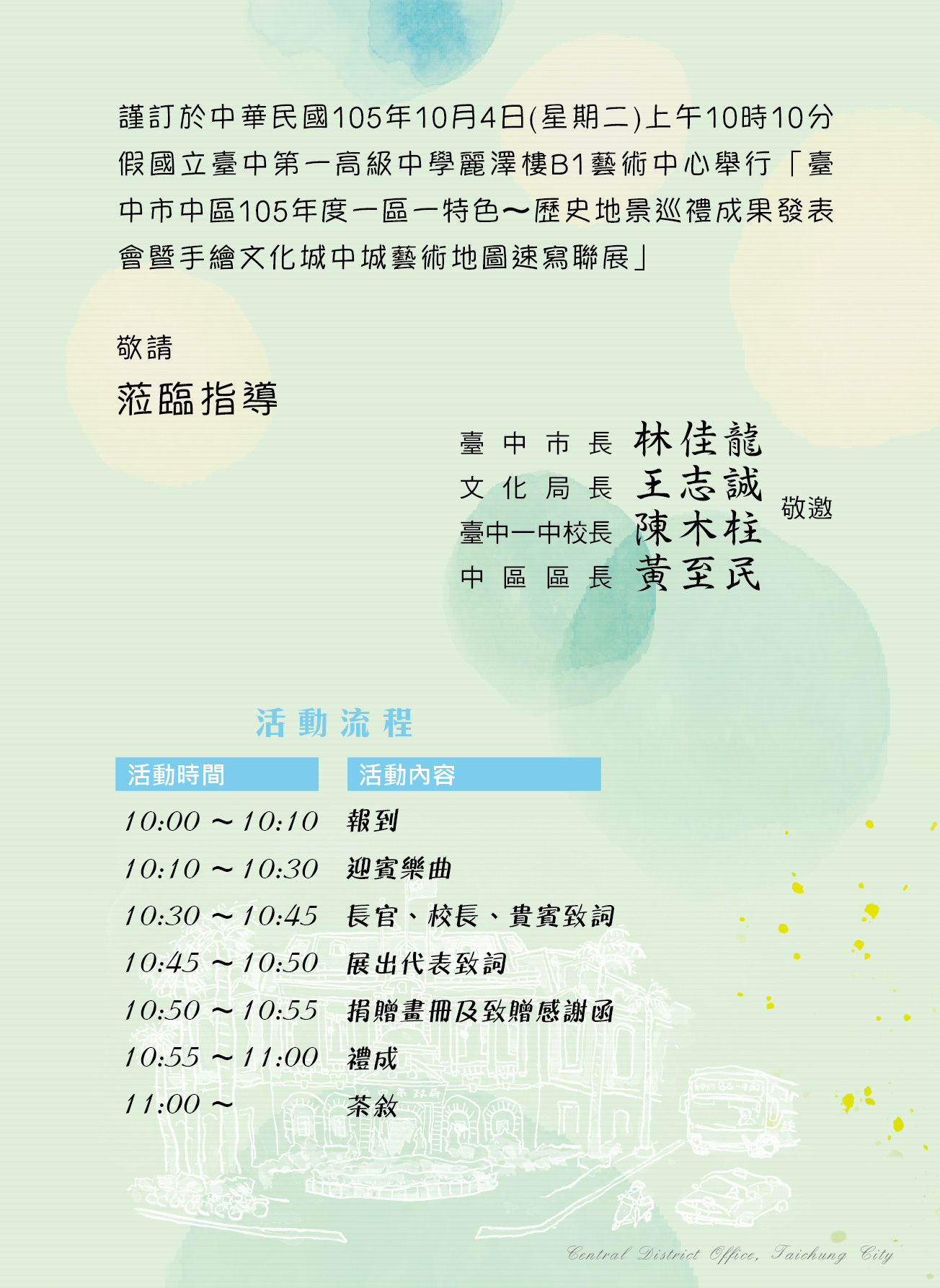 臺中市中區105年度一區一特色歷史地景巡禮成果發表會暨手繪文化城中城藝術地圖速寫聯展,將於本(105年)9月19日起進行,本聯展共分為2處展場,分別於國立臺中第一高級中學麗澤樓B1藝術中心(105年9月19日起至10月11日中午止)與本所3樓藝文展示區(105年10月3日起至12月31日止)辦理,並訂於本(105)年10月4日上午10時起假臺中一中藝術中心舉行成果茶會,歡迎蒞臨參觀。