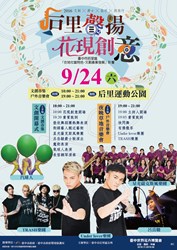 后里區公所於105年9月24日(星期六)上午10時至晚間21時,於本區后里運動公園,舉辦「后里聲揚-花現創意」文創市集及戶外音樂會,敬請踴躍參加!