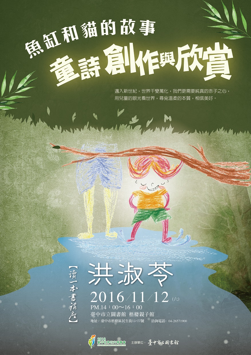 一、講座邀請台大中文系洪淑苓教授分享「魚缸和貓的故事--談童詩創作與欣賞」,帶領民眾透過日常生活題材,加上想像力及幽默感,寫出一首首可愛的童詩。二、時間:105年11月12日(六)下午2時至4時。三、地點:本館梧棲親子館(臺中市梧棲區民生街15-77號)。四、公教人員全程參與者核予終身學習時數2小時。 聯絡人:曾敬傑 聯絡電話:0424225101#507