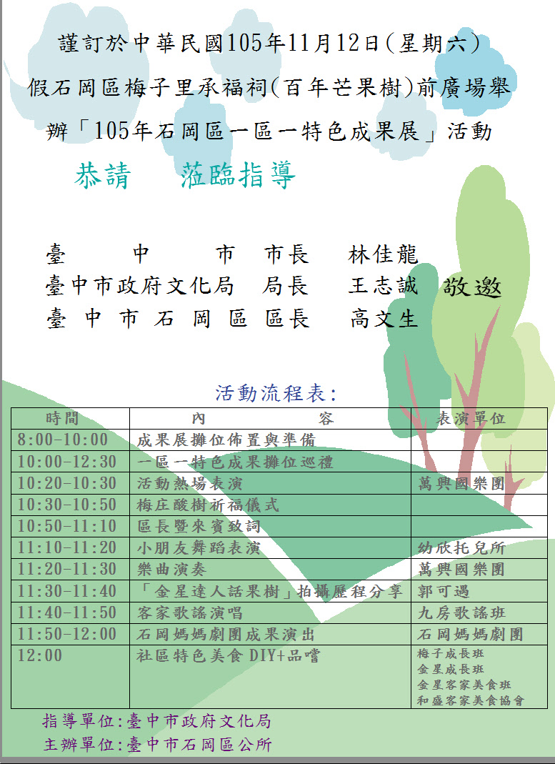臺中市石岡區公所訂於105年11月12日(星期六)上午10時於本區梅子里承福祠(百年芒果樹)廣場辦理105年石岡區一區一特色成果展