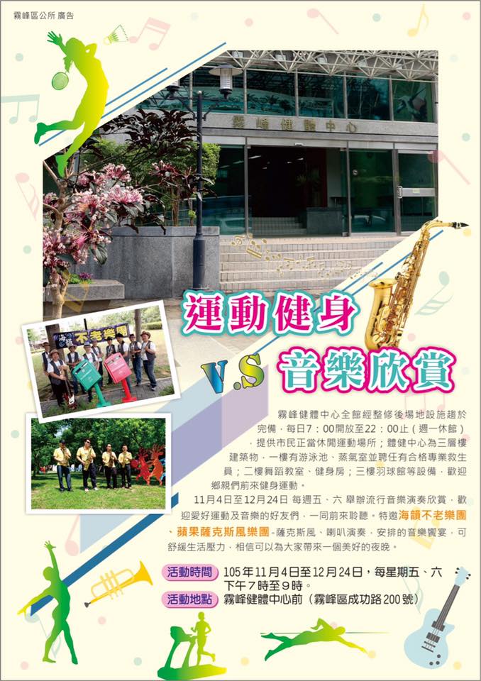 霧峰區公所於11月4日至12月21日,每週五、六下午七時至九時,在健體中心前,辦理街頭藝人表演,讓熱愛音樂的同好及人才有展演的空間及機會,亦可讓區民及在地愛好音樂人士、以樂會友能培養、欣賞、提升市區民音樂素養與興趣,豐富本區街頭藝術表演型態,提升街頭藝術品質與表演多元性,並營造霧峰人文風貌,提高精神生活層次,增進本區健體中心之使用及曝光率,歡迎鄉親、學生前來觀賞音樂及使用健體中心設備。