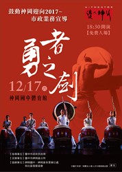 千騎擁高牙,乘醉聽簫鼓~優人神鼓(王者之劎)—「鼓動神岡迎向2017~市政業務宣導」活動,神岡區公所訂於105年12月17日下午6時30分起假神岡區神岡國中大禮堂舉辦,邀請國際級演出團體『優人神鼓』演出『勇者之劍』鼓樂劇,本劇曾前往北美公演,在馬里蘭州陶松大學、印第安納波利斯巴特勒大學、加拿大渥太華國家藝術中心、多倫多萬錦市劇院…等地公演,獲得好評不斷,邀請您聆賞歲末最高水準的音樂盛宴!歡迎踴躍前往參加。 聯絡人:王銘釧 聯絡電話:04-25620841#131