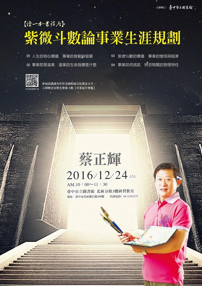 一邀請紫微斗數專家-蔡正輝分享「紫微斗數論事業規劃」,透過閱讀講座在工作上趨吉避凶,並從古老數算的角度,揭開命盤中諸星影響事業的神秘面紗。