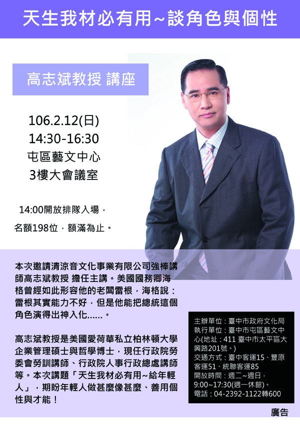 屯區藝文中心訂於106年2月12日(星期日)舉辦高志斌教授「天生我材必有用~談角色與個性」講座。高志斌教授為美國愛荷華私立柏林頓大學企業管理碩士與哲學博士,現任行政院勞委會勞訓講師、行政院人事行政總處講師等。本次講題「天生我材必有用~談角色與個性」,期盼人人做甚麼像甚麼、善用個性與才能!