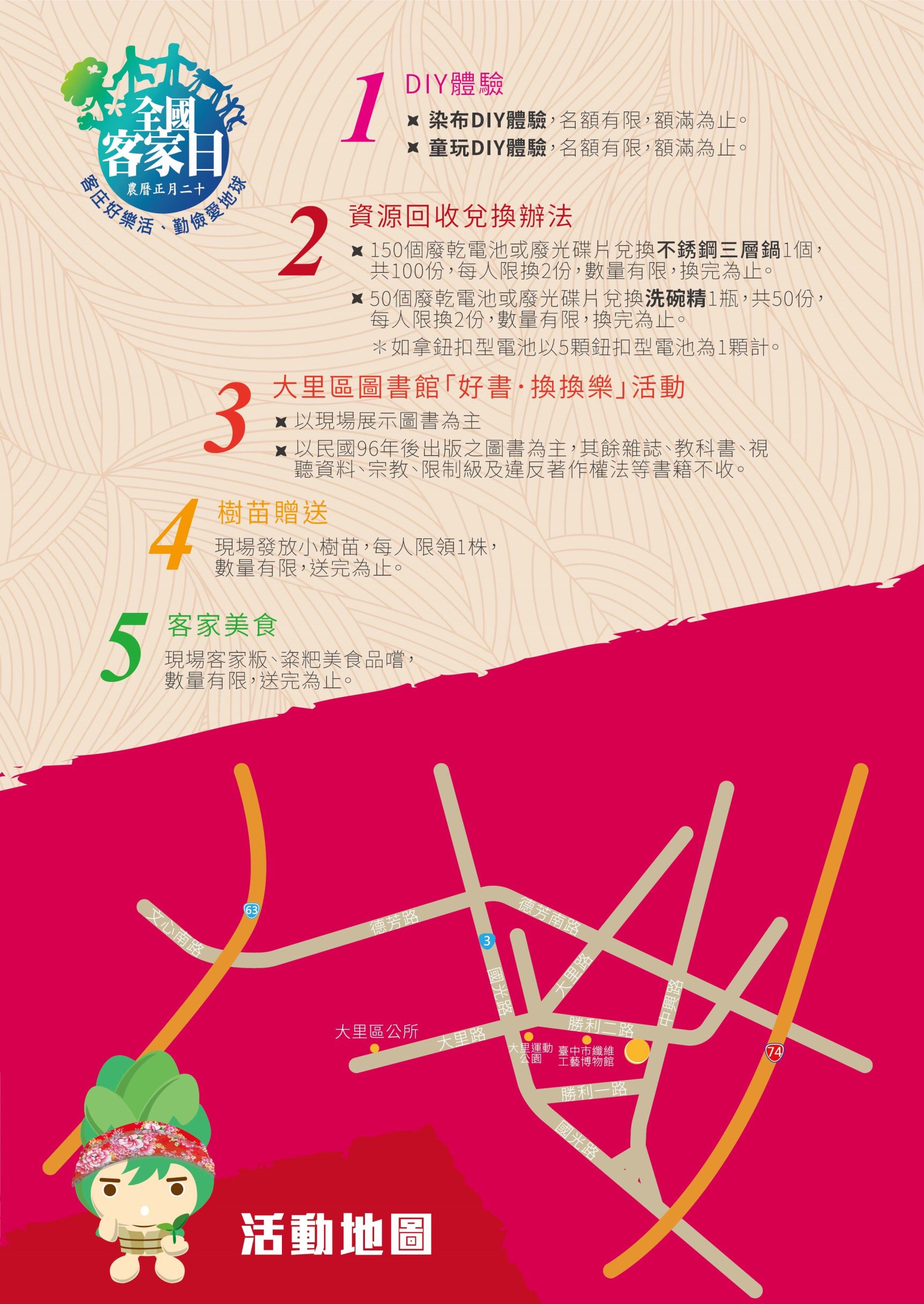 大里區公所辦理「106年全國客家日~大里杙起客家好樂、環保愛地球」,敬請貴單位協助宣傳並鼓勵所屬踴躍參加!