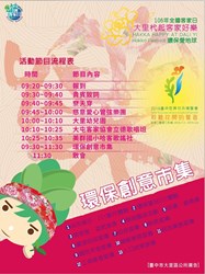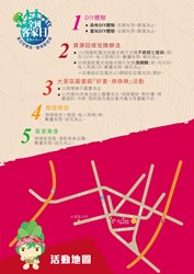 四、活動安排精彩客家藝文表演,結合樹苗贈送、資源回收宣導兌換好禮、染布及環保童玩DIY、客家粄、粢粑美食品嚐、圖書館好書.換換樂活動及大屯稽徵所稅務宣導等政令宣導攤位,歡迎踴躍參加。