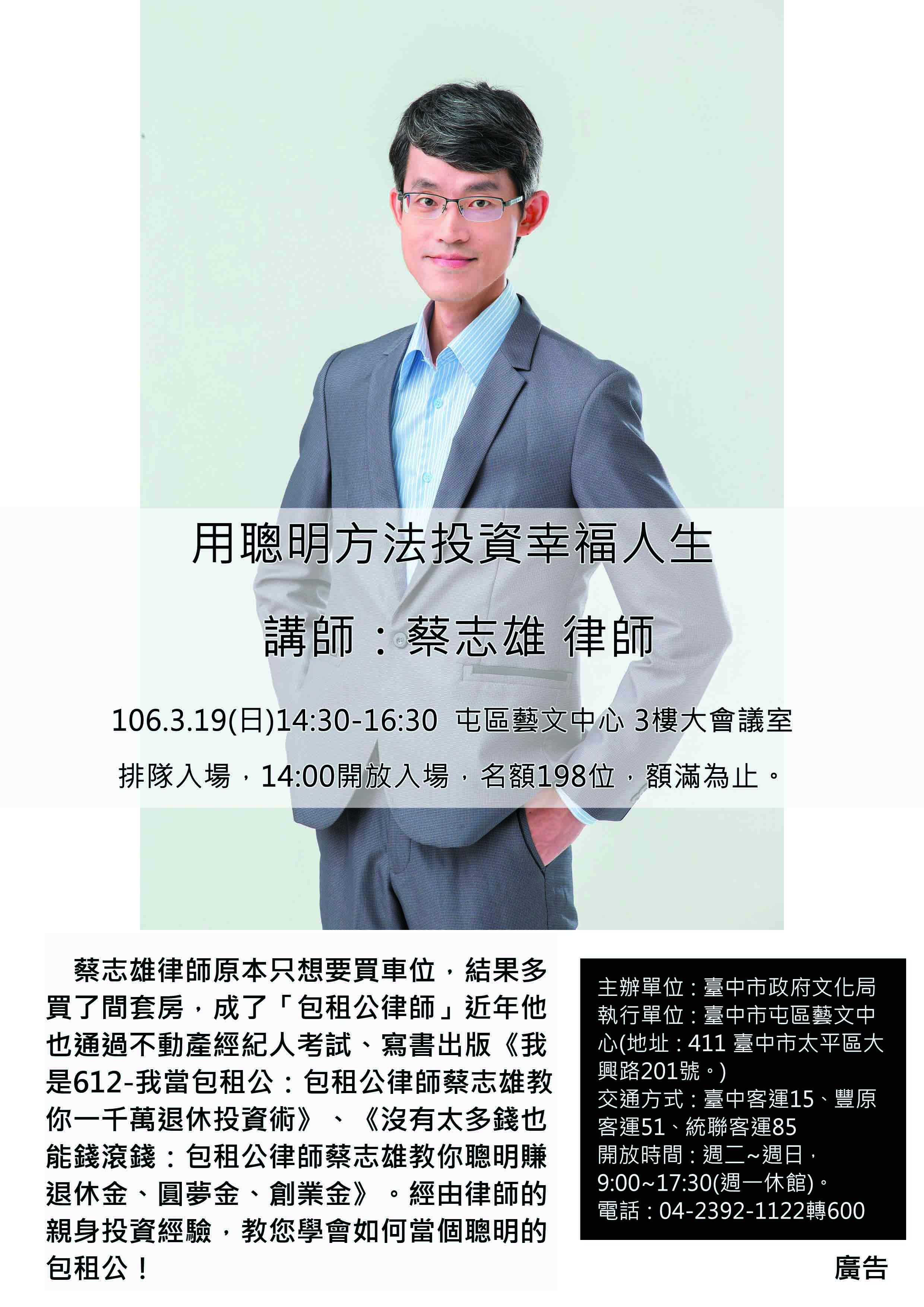 屯區藝文中心訂於106年3月19日(星期日)舉辦蔡志雄律師講座「用聰明方法投資幸福人生」,蔡志雄為現職律師、不動產經紀人、好房網、Yahoo奇摩房地產、女人變有錢、鉅亨網專欄作家,著有《我是612--我當包租公》等書籍。