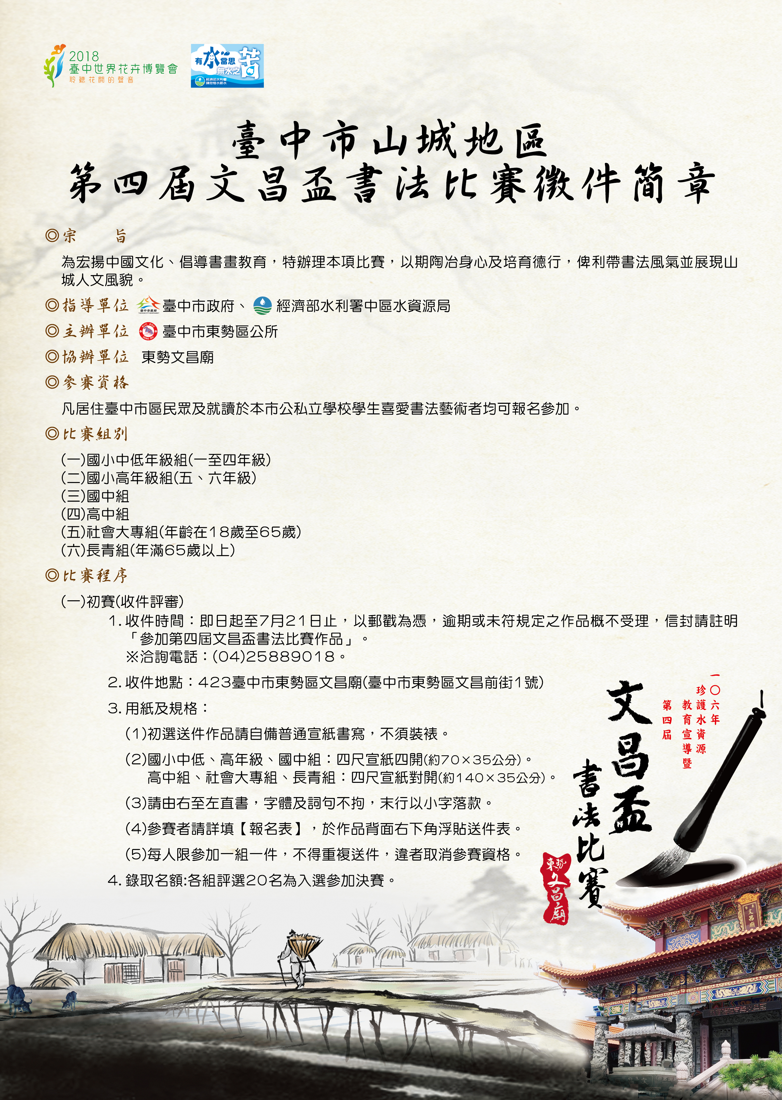 1.收件時間:即日起至7月21日止,以郵戳為憑,逾期或未符規定之作品概不受理,信封請註明「參加第四屆文昌盃書法比賽作品」。洽詢電話:(04)25889018。