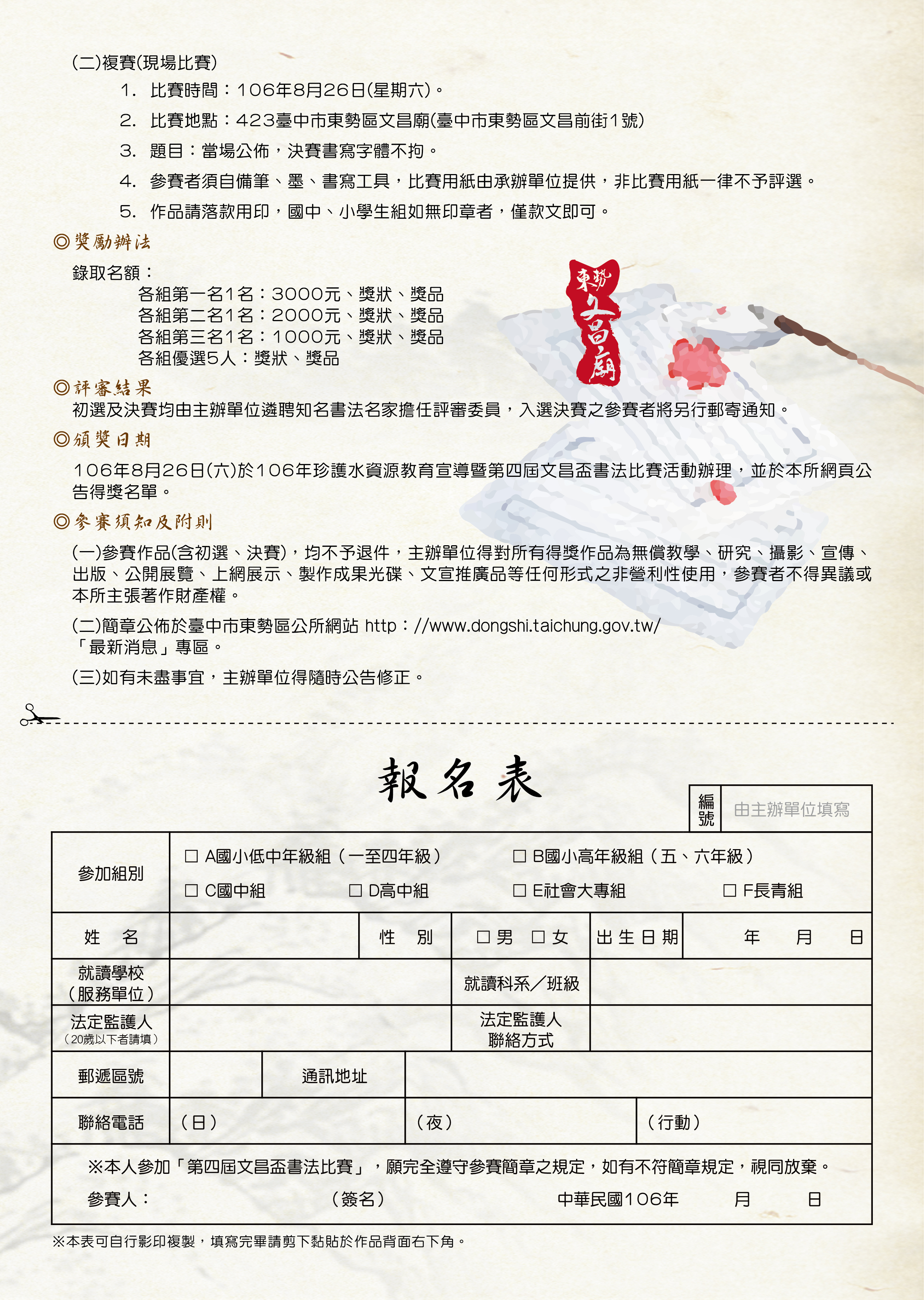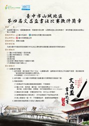 三、參賽資格:凡居住臺中市區民眾及就讀於本市公私立學校學生喜愛書法藝術者均可報名參加。