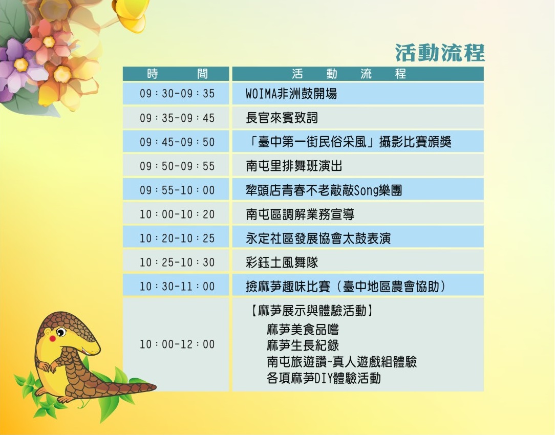 一、「106年臺中南屯麻芛文化嘉年華暨調解業務宣導」活動訂於106年8月19日(星期六)上午9時30分至12時在本市南屯區臺中市萬和宮前廣場辦理,規劃精采舞臺表演、麻芛美食市集、南屯旅遊讚大富翁遊戲及DIY體驗等民俗節慶暨產業推廣活動,歡迎大家踴躍參與。二、檢附「106年臺中南屯麻芛文化嘉年華暨調解業務宣導」海報及活動流程電子檔一份。 聯絡人:江小姐 聯絡電話:(04)24752799#306