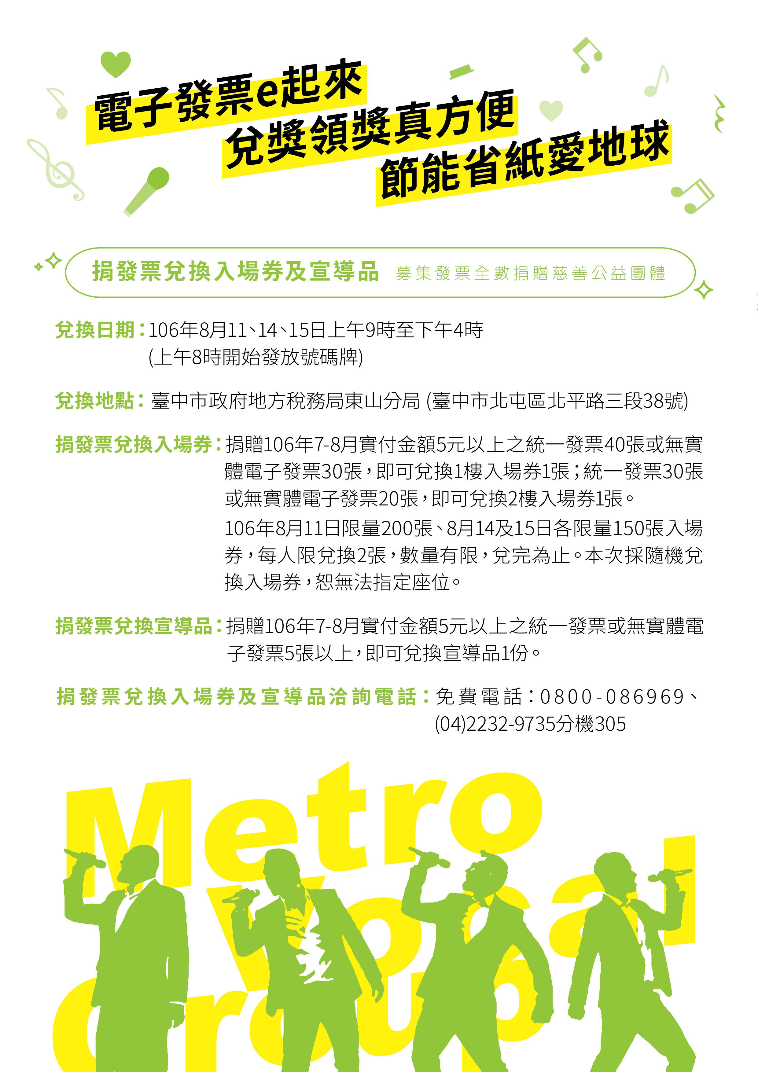 (三)兌換方式:捐贈106年7-8月實付金額5元以上之統一發票40張或無實體電子發票30張,即可兌換1樓入場券1張;統一發票30張或無實體電子發票20張,即可兌換2樓入場券1張。每人限兌換2張,數量有限,兌完為止。
