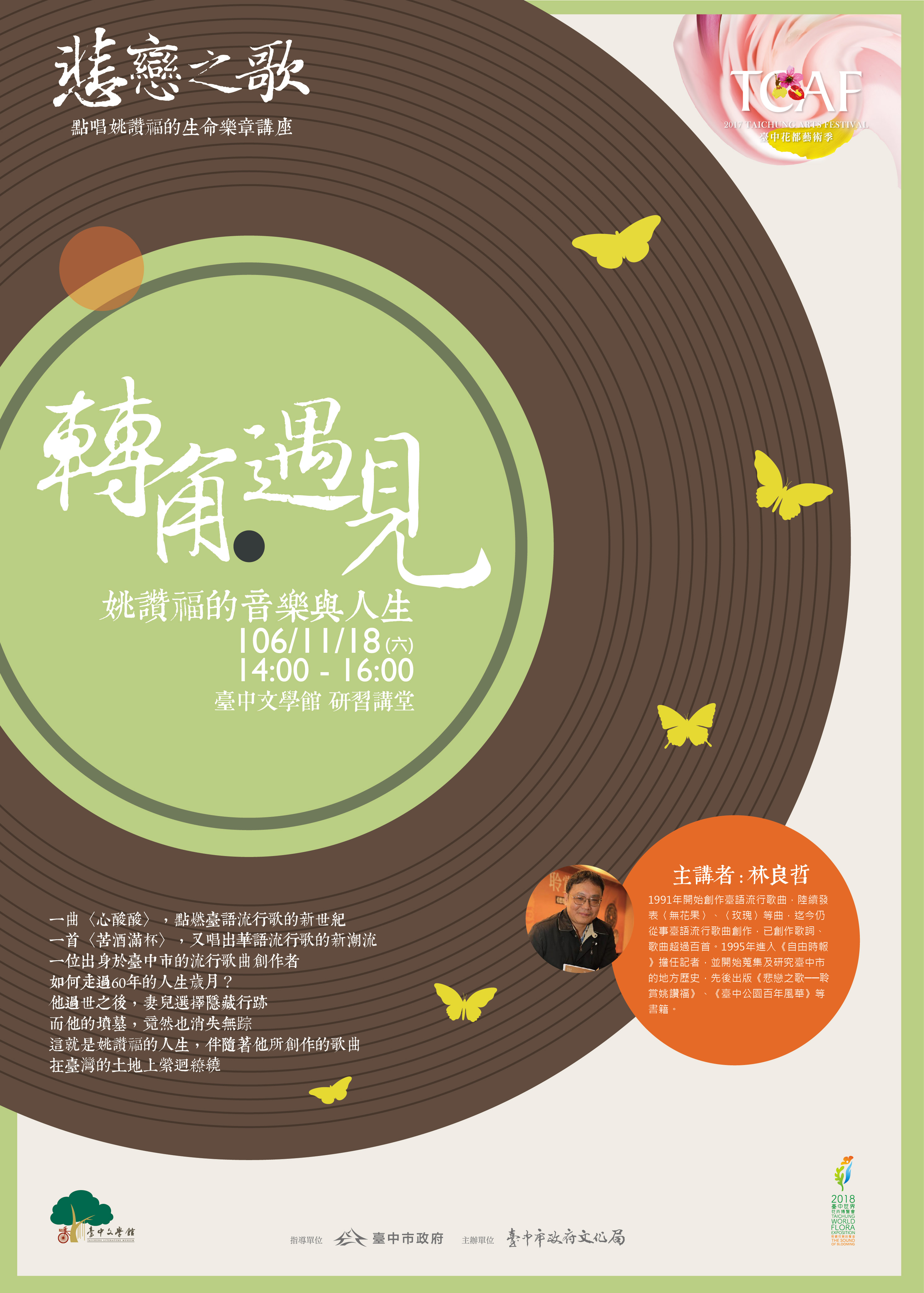 講師:林良哲,1991年開始創作臺語流行歌曲,陸續發表〈無花果〉、〈玫瑰〉、〈鵝媽媽要出嫁〉等曲,迄今仍從事臺語流行歌曲創作,已創作歌詞、歌曲超過百首。1995年進入《自由時報》擔任工作記者,並開始蒐集及研究臺中市的地方歷史,先後出版《悲戀之歌──聆賞姚讚福》、《臺中公園百年風華》等書籍。