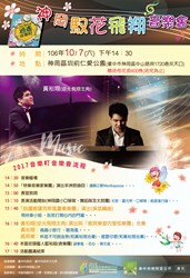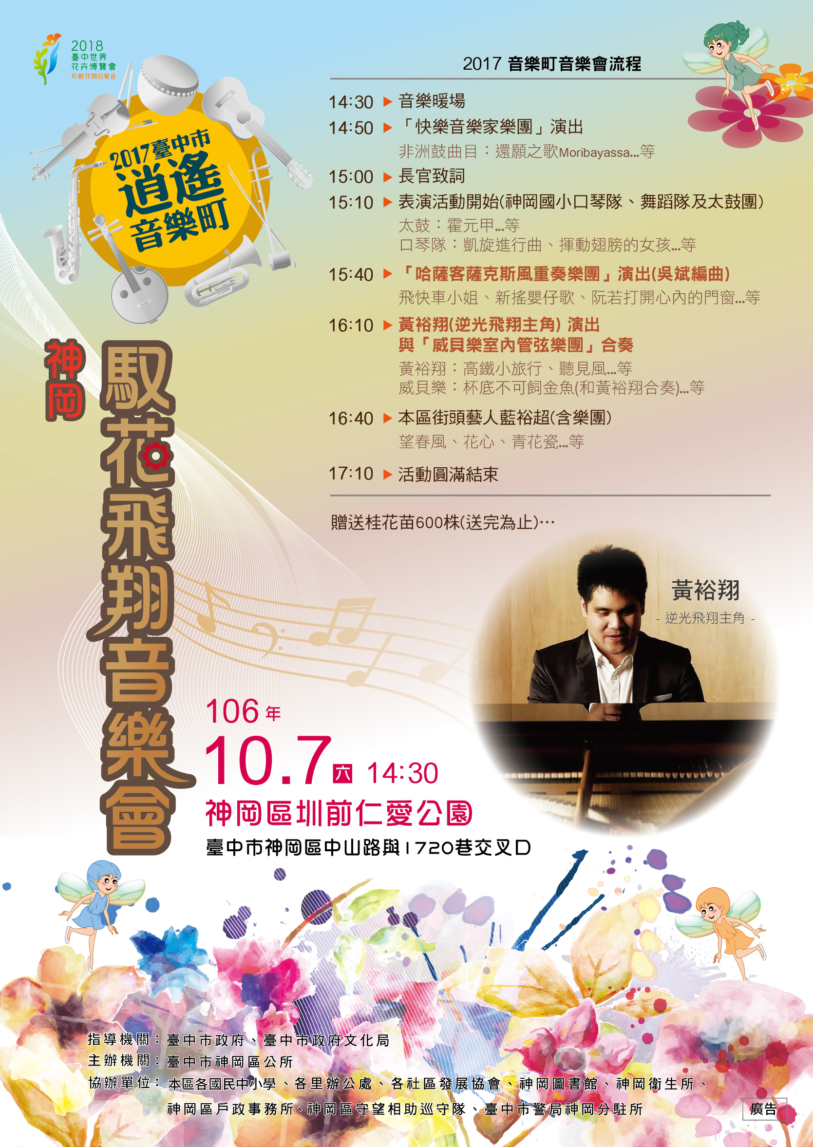 2017臺中市逍遙音樂町─馭花飛翔音樂會,本(106)年10月7日下午2時50分假神岡區圳前仁愛公園廣場舉辦,邀請第27屆金曲獎最佳作曲人獎,也是逆光飛翔主角的臺中人─「黃裕翔」到場演出,還有神岡國小口琴隊、太鼓隊、舞蹈社、「快樂音樂家樂團」、「鴻輝樂團」等優秀演藝團隊演出動人樂曲;此外,本區「哈薩客薩克斯風重奏樂團』將演出改編自呂泉生教授精采音樂『飛快車小姐』等樂曲,邀請您前來聆賞今秋最高水準的音樂盛宴! 為迎接2018臺中世界花卉博覽會,現場農業局將贈送桂花樹苗600株供綠美化環境,每人1株先到先贈,贈完即止;另可以9~10月份發票至本所農建課攤位兌換農特產品、國稅局攤位兌換宣導品等,數量有限兌完即止,歡迎市民踴躍參加。 聯絡人:王銘釧 聯絡電話:04-25620841#131
