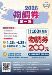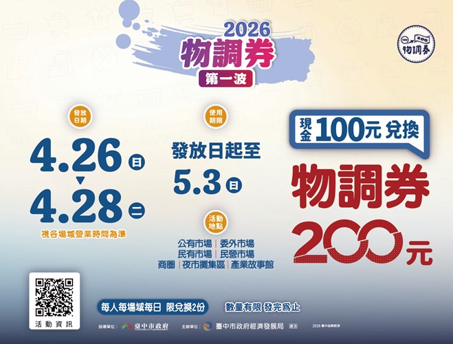 2026物調券第一波 臺中市政府經濟發展局 2026-04-13 「2026物調券第一波」活動即將開跑 發放時間:4/26(日)-4/28(二)【視各場域營業時間調整】 使用時間:4/26(日)-5/3(日) 詳情請點選:https://www.economic.taichung.gov.tw/3248394/post